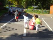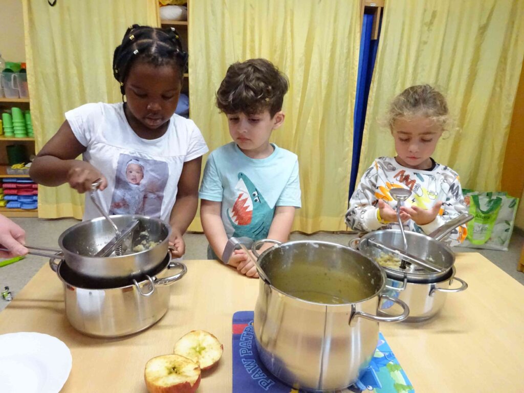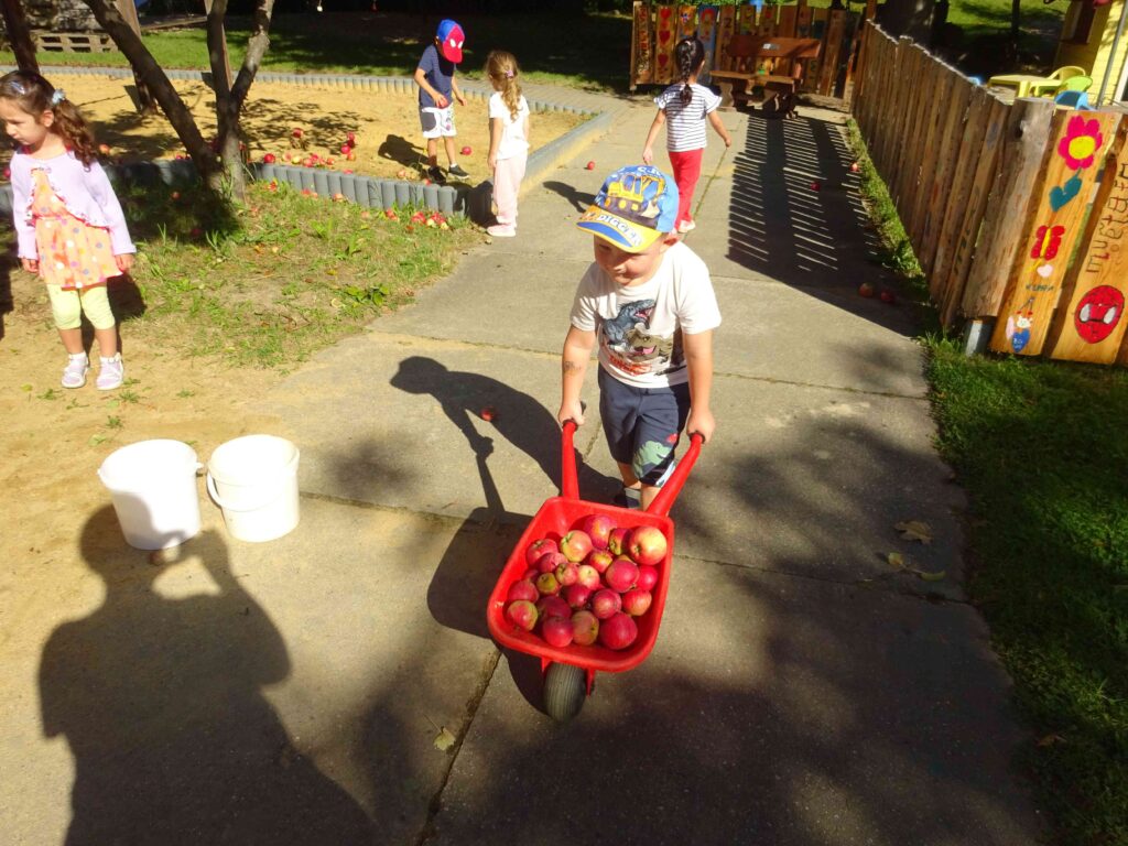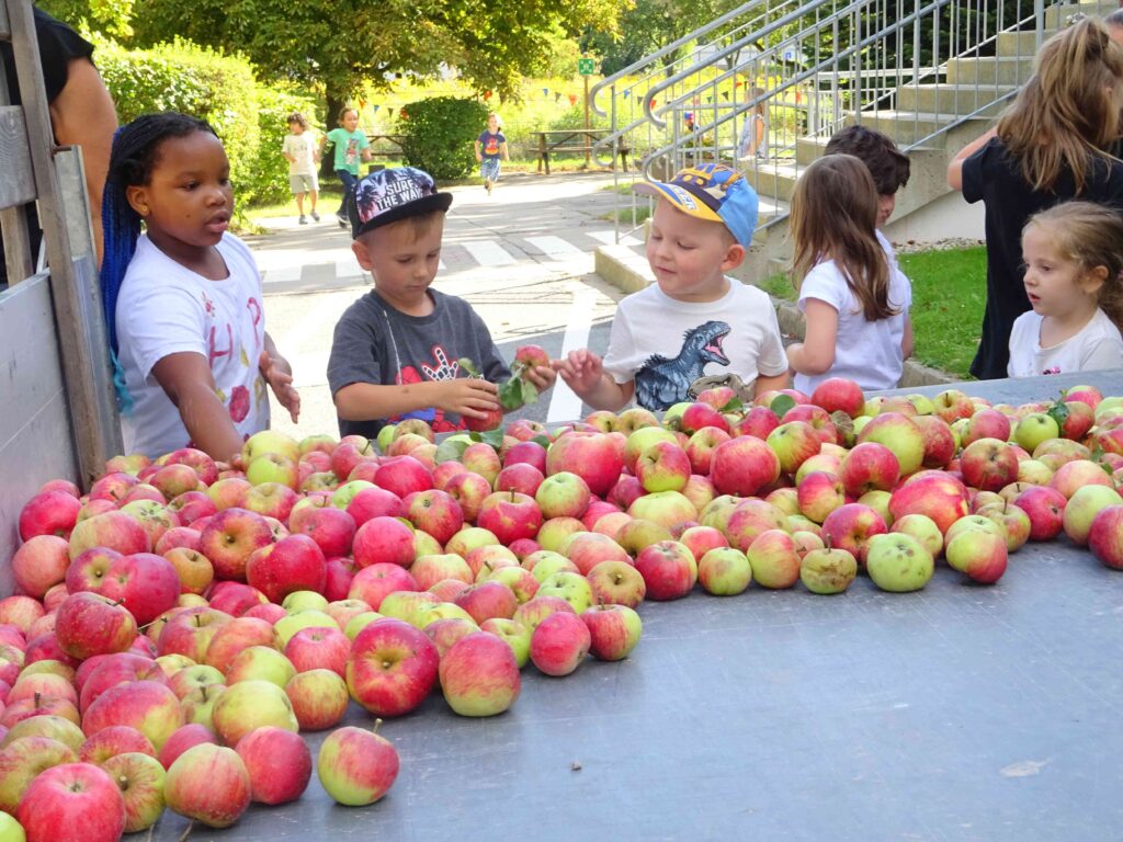Unsere Apfelbäume haben dieses Jahr gut getragen. Doch was machen wir mit den vielen Äpfeln? Man kann sie nicht nur essen, sondern auch verarbeiten, zum Beispiel zu einem Apfelkuchen, zu Apfelmus oder zu Apfelsaft. Die fleißigen Kinderhände ernteten und sammelten die Äpfel auf und brachten sie mit viel Einsatz zu einem großen Hänger. Aus „unseren“ Äpfeln wird nun Apfelsaft gepresst. Wir sind gespannt, wie er schmecken wird!